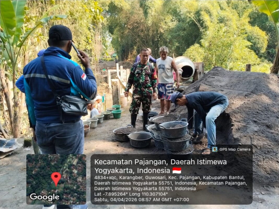 Bantul – Babinsa Kalurahan Guwosari Sertu Hendrawan melaksanakan kegiatan pembangunan Jembatan Garuda yang berlokasi di Dusun Santan RT 04. Kegiatan hari ini difokuskan pada pemasangan pondasi sisi timur sebagai bagian dari tahap awal konstruksi jembatan guna menunjang akses transportasi masyarakat setempat. Sabtu, (4/4/2026).