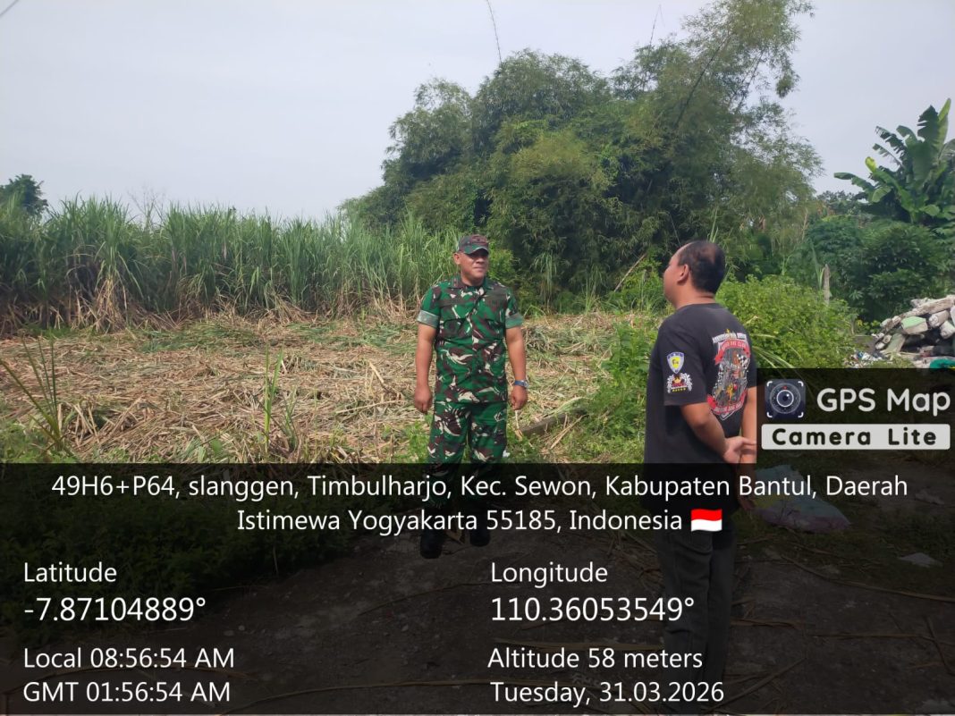 Bantul – Danramil Sewon Kodim 0729/Bantul memimpin langsung kegiatan penataan lahan di lokasi KDKMP Kalurahan Timbulharjo, Kapanewon Sewon, Kegiatan diawali dengan pemotongan sebagian pohon tebu yang berada di belakang lokasi sebagai upaya pembersihan dan penyiapan area. Selasa, (31/03/2026).