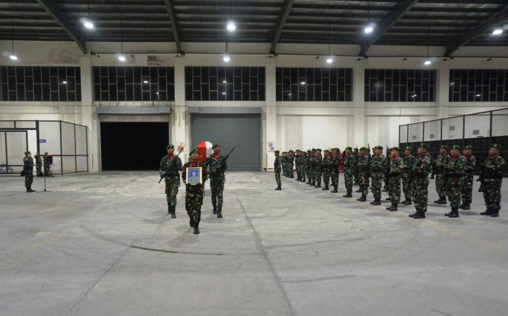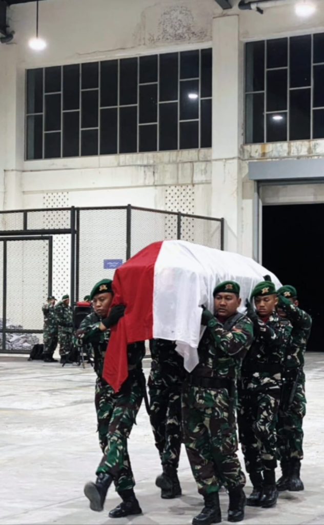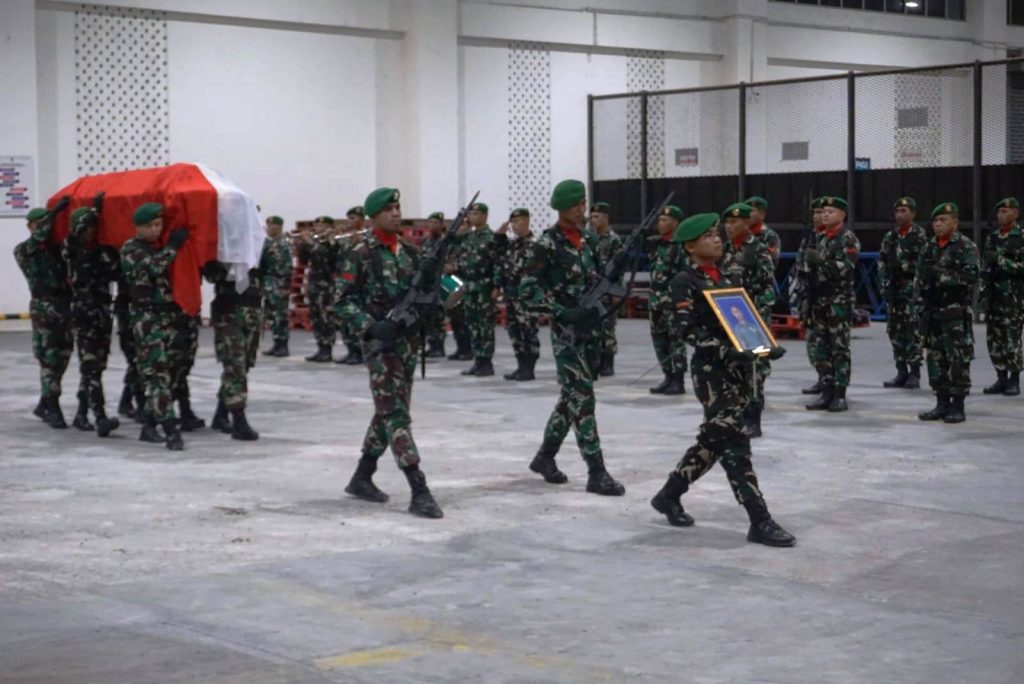 Pukul 21.01 WIB jenazah almarhum Praka Amin Nurohman tiba di Bandara YIA Kulon Progo dengan pendamping Pasiminlog Satgas 410/Alg Kapten Inf Priyanto, langsung dibawa menuju Area Incoming Cargo Bandara YIA untuk dilangsungkan prosesi Upacara Jajar Hormat. Selesai upacara jenazah almarhum dibawa menuju rumah duka di Desa Banjurpasar, Kecamatan Buluspesantren, Kabupaten Kebumen, Jawa Tengah, untuk dimakamkan. Upacara pemakaman secara militer akan dilaksanakan hari ini Selasa, (14/10/2025).