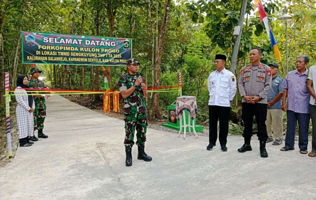 KULON PROGO. Kegiatan TNI Manunggal Membangun Desa Sengkuyung Tahap I TA 2026 Kodim 0731/Kulon Progo, yang digelar di wilayah Padukuhan Salam, Kalurahan Salamrejo, Kapanewon Sentolo, KabupatenKulon Progo telah selesai dilaksanakan dan ditutup secara resmi pada Hari Rabu tanggal 11 Maret 2026.Peresmian hasil kegiatan TMMD ditandai dengan pengguntingan pita dan pemecahan kendi berisi air bunga di jalan rabat beton oleh Dandim 0731/Kulon Progo Letkol Inf Dyan Niti Sukma, S.I.P., M.Han., didampingi Pejabat Forkopimda dan OPD terkait, dilanjutkan dengan peninjauan hasil kegiatan TMMD.Pasiter Kodim 0731/Kulon Progo Kapten Inf Nadiya menyampaikan bahwa seluruh sasaran fisik maupun non fisik kegiatan TMMD telah selesai dikerjakan dam waktu 30 hari mulai tanggal 10 Februari s.d. 11 Maret 2026, dengan melibatkan personel 70 orang setiap hari terdiri dari TNI, Polri, Aparat Pemerintahan, Relawan dan Masyarakat. Sasaran fisik kegiatan TMMD berupa rabat beton jalan 487 m x 3 m x 0,12 m, pembuatan talud 229 m x 0,3 m x 0,8 m, pengecatan Masjid Al-Alim dan pengecatan Pos Ronda, selesai seratus persen. Sasaran non fisik yakni sosialisasi Wasbang, penyuluhan penanggulangan bencana alam, penyuluhan narkoba dan binkamtibmas, penyuluhan stanting dan penyakit menular, bagi warga masyarakat juga telah dilaksanakan seluruhnya. Anggaran yang digunakan total 315.450.000 bersumber dari APBD Provinsi DIY 75.000.000 rupiah, APBD Kabupaten Kulon Progo 182.500.000 rupiah, APB Kalurahan Salamrejo 20.000.000 rupiah dan swadaya masyarakat 37,950.000 rupiah.Dandim 0731/Kulon Progo berpesan kepada Pemerintah Kalurahan dan warga masyarakat Kalurahan Salamrejo agar hasil-hasil kegiatan TMMD ini dipelihara dan dirawat dengan sebaik-baiknya agar awet atu memiliki masa pakai yang lama dan membawa manfaat bagi warga masyarakat. Semoga dengan pembangunan ini arus transportasi dan perekonomian dapat semakin lancar sehingga dapat meningkatkan kesejahteraan masyarakat. (Pendim0731).